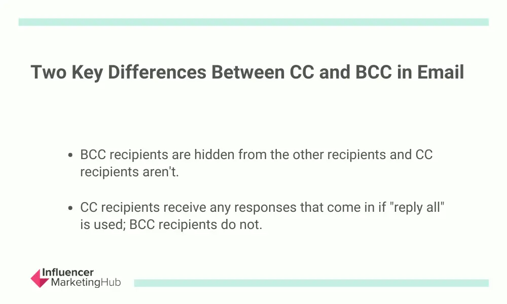 In a nutshell, CC lets all recipients see the list of recipients and their email addresses as well as getting all responses to the email. BCC recipients are hidden from each other and the other recipients and won’t be sent responses.