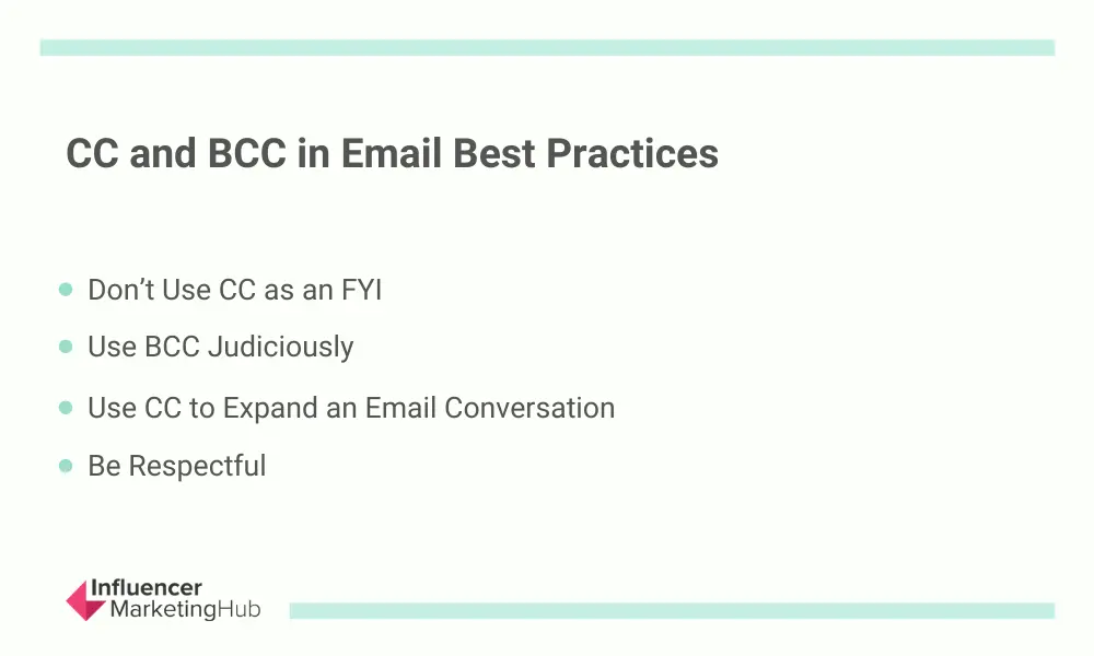 This applies to both CC and BCC in email. No matter what you’re doing with your email and recipients, be respectful. This means not sending unnecessary emails, not overloading the recipients list and clogging up inboxes, and not sharing personal data and personal conversations with others without their consent.