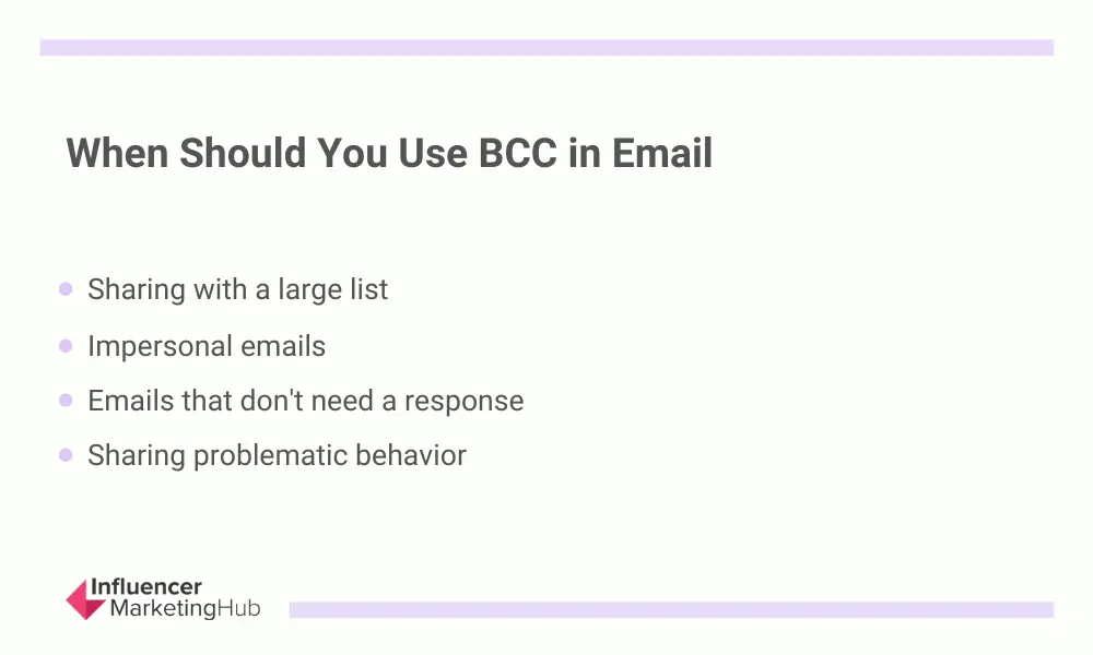 - Impersonal emails not requiring a response: if you’re sending an announcement or something that is impersonal, BCC is a great option
