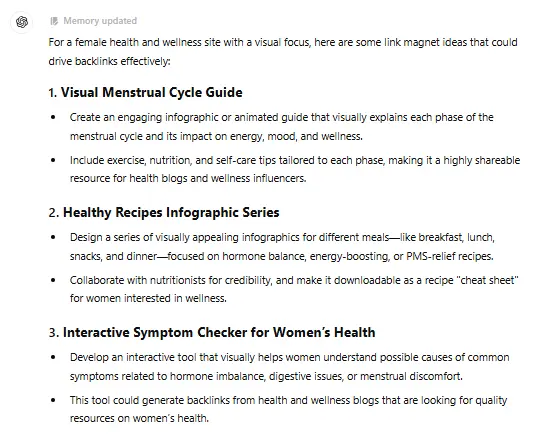 Also, when using ChatGPT to generate link magnet ideas, make sure you're still doing your own research. Will the link magnet be relevant? Do you have the resources to create it?