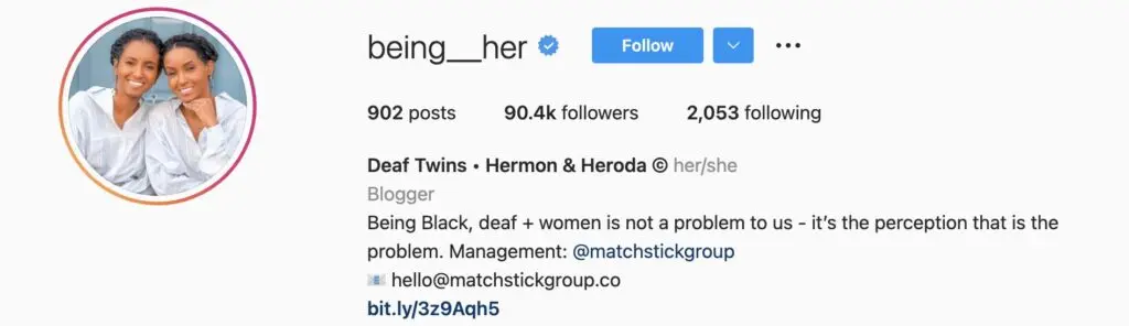 Hermon and Heroda are two identical twins with a hearing disability who have taken to social media to help create better representation for and more awareness about the deaf community (and black women). In an interview with Vogue, they’ve shared that being black and deaf is a “double struggle”. That said, they add that to them the problem is not being black and deaf, but the perception that it should be an issue.