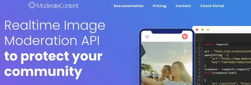 One of the major appeals of ModerateContent is their moderate pricing. Similarly to Sightengine, they also offer a decent Free plan that lets you moderate up to 1,000 images per month. Then, they also offer you the option to pay as you go. Once you’ve exceeded the 10,000-limit of the Free plan, the pay-as-you-go plan will charge you only $0.15 per 1,000 images. And, for the heavy users, their Enterprise plan comes at a reduced rate of $0.10 per image (but requires a monthly commitment of $100). On top of their flexible pricing, their real-time image moderation API is easy to integrate into your site, platform, or app.