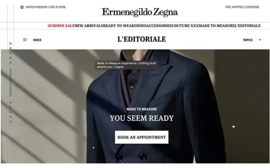 Ermenegildo Zegna uses clear and relevant call-to-action buttons. The white button contrasts well on the dark background as does the black text of the call-to-action prompt against the white background of the button. This clever use of color helps the CTA to stand out.