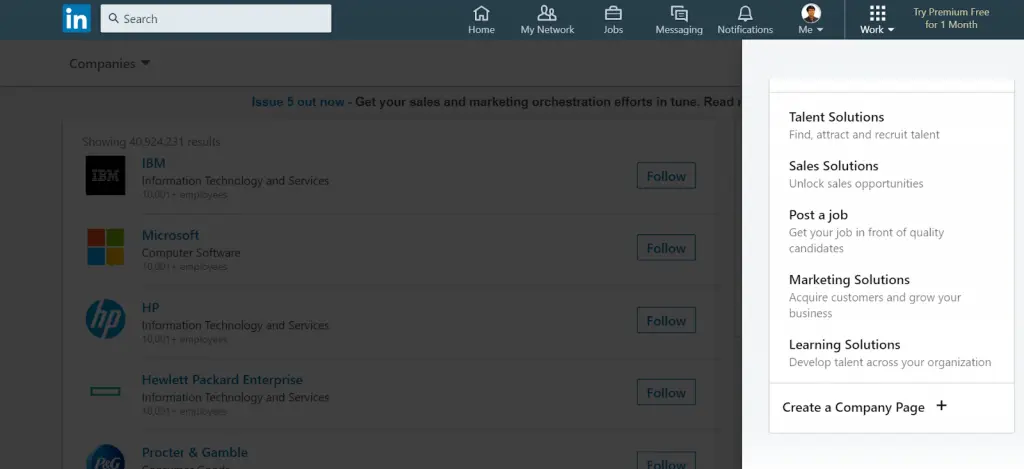 First, you need to click on the “Work” button on your page. Then, click on “Create a Company Page.”