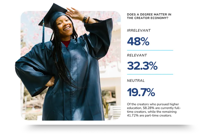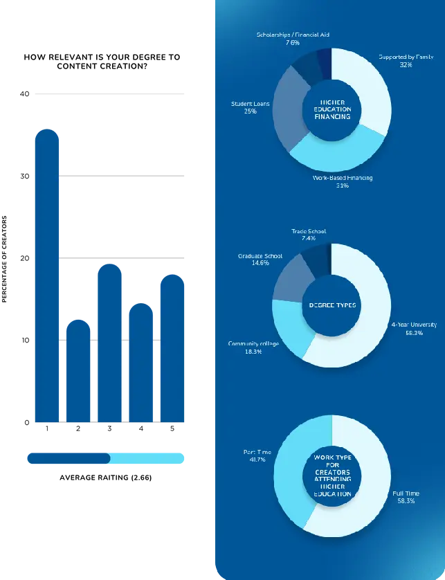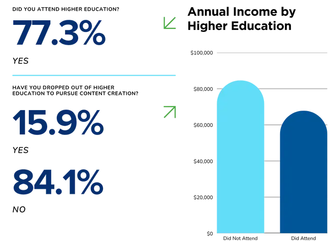 Most creators financed their education through either working, their family’s support, or taking on student loans. Only a fraction of creators have dropped out to pursue content creation instead of higher education.