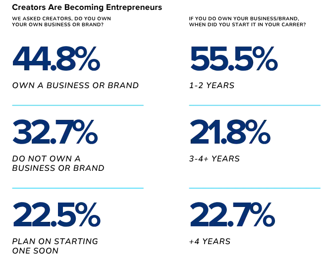 One of the most important aspects for creators is their ability to brand themselves. Many creators have begun taking this to the next level by building their own brands as well. The results are an astounding yes, in which nearly 45% of creators own some form of business or brand in addition to their standard content creation.