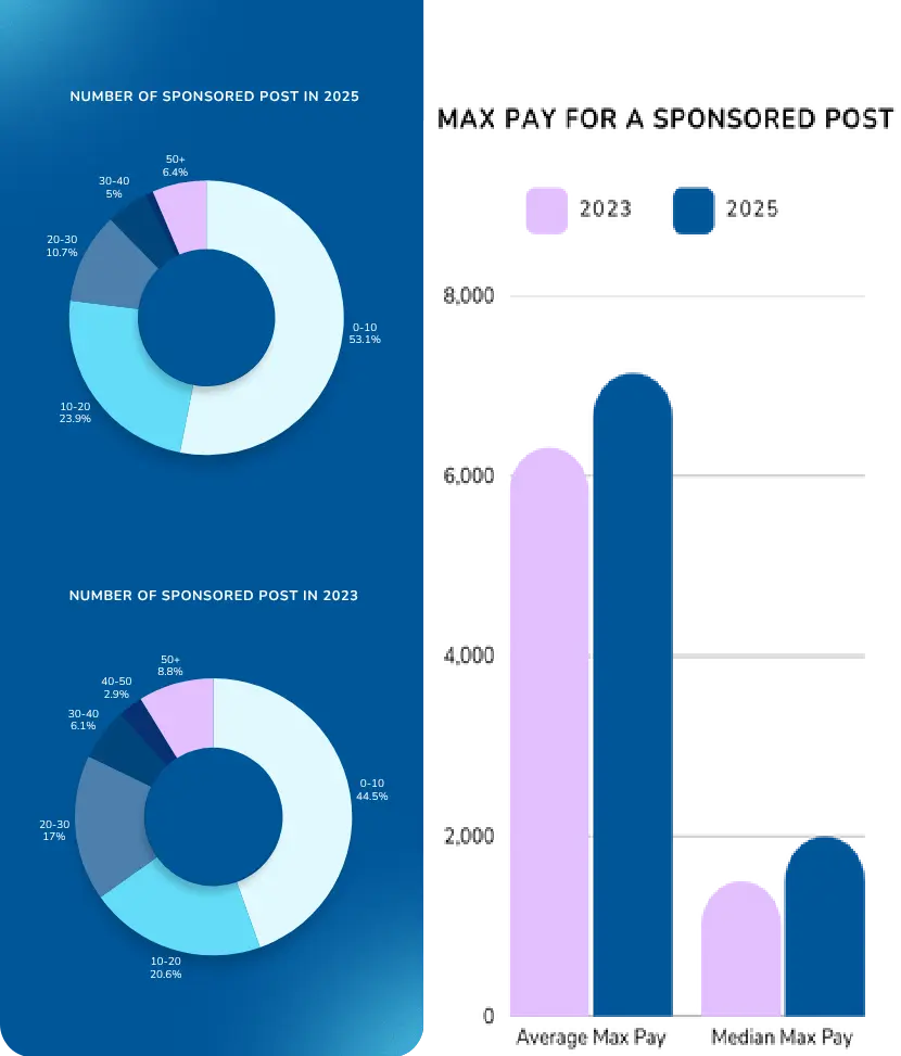 Compared to our data from last year, the average max pay of a sponsored post has risen by $1,150, while the average median pay of a sponsored post has risen by $1,000. This indicates that the rates for creator content have significantly risen and will likely continue to do so as both inflation and the value of influencer content increases.