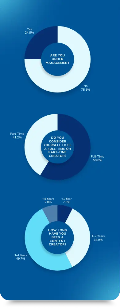 Notably, only 1 in 4 creators reported being under formal management. The remaining three-quarters operate independently, suggesting that even among seasoned creators, many are still navigating brand deals, negotiations, and strategy on their own.