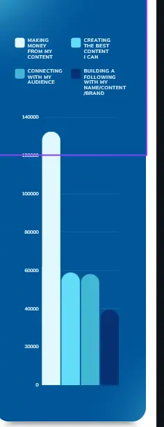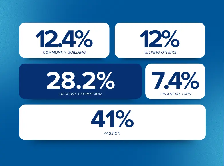 Why do creators start creating? We asked this to uncover the driving force behind today’s most influential voices. Most respondents say they’re motivated by passion or a desire for creative expression. The least cited reason? Creating purely for financial gain.