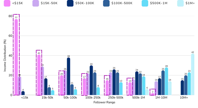 The Monetization Barrier - Once annual earnings exceed $15,000, creators exhibit an acceleration in income growth. Crossing this threshold indicates a turning point for creators with increased access to brand partnerships, enhanced platform visibility, and rapid audience expansion. Creators who fail to surpass this benchmark often struggle to scale their income and will plateau around that point. Not from a lack of talent or reach, but because they likely aren’t structured for monetization. Without a strategy for converting influence into income, their revenue stays disconnected from their growth, effectively capping their potential under $15k annually.