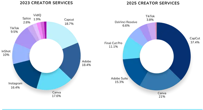 Capcut’s prominence has shown itself both on the creator stage and in our survey. Other notable mentions included a rise in Adobe Suite and Canva’s usage, while a significant decrease occurred for InShot, dropping down to 4.1%.