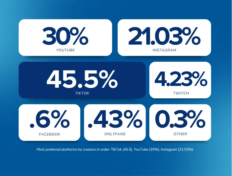 Instagram currently leads in average annual income, bolstered by a handful of top-earning creators that significantly elevate the platform’s earnings. TikTok, despite its large respondent base, has the heaviest concentration of lower income brackets, highlighting ongoing monetization challenges for a sizable portion of its creator base.