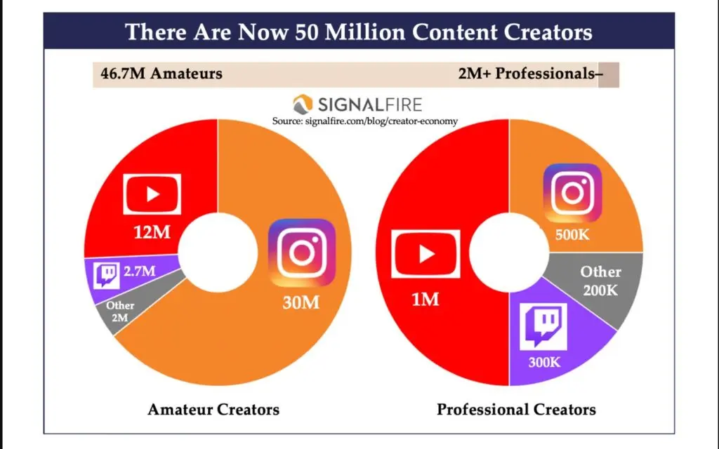 The creator economy is considered the fastest-growing classification of a small business. According to SignalFire’s Yuanling Yuan and Josh Constine, there are approximately 2 million professional individual creators who make a living on a full-time basis by making content.