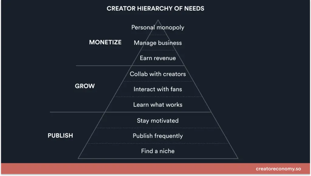 According to Peter Yang of the Creator Economy, creators have a unique set of needs, which he organized in a hierarchy. Think of Abraham Maslow’s popular model, but geared toward content creators.