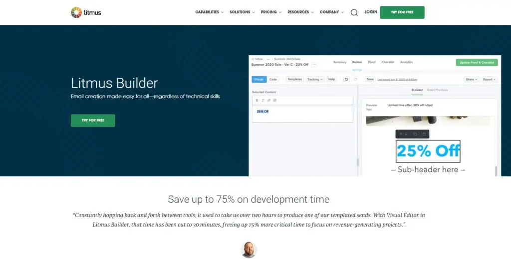 Another approach is to use a specialist email builder like Litmus Builder, to create your emails. Developers can use the HTML Code Editor to build emails and templates from scratch. Others ("email stakeholders," according to Litmus), can use the Visual Editor to create on-brand, error-free emails without needing to code.