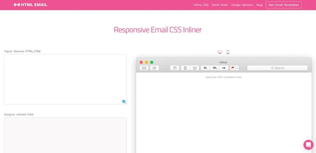 HTML Email's Responsive Email CSS Inliner works much like most of the products listed here. You enter your source HTML/CSS into a box, and then it displays the resulting Inlined CSS in another box.
