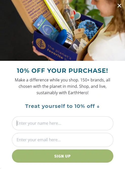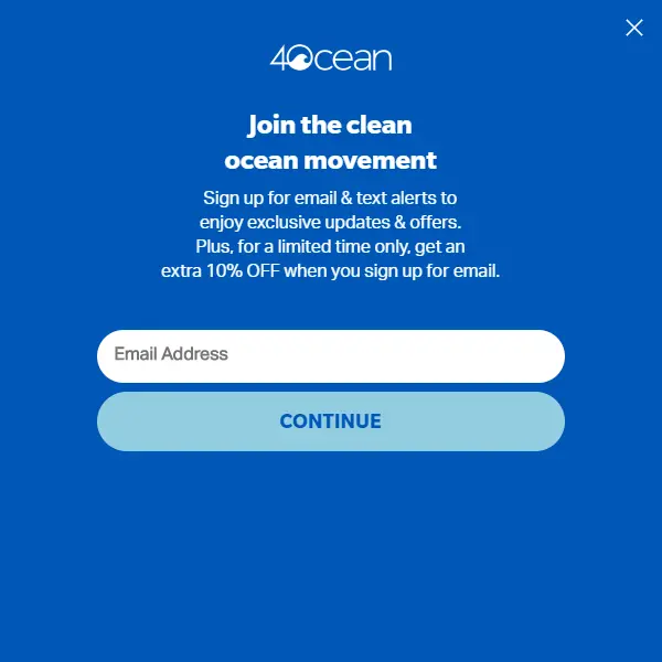 This is one of the more simple CTA examples but it’s just so effective. Everything about the popup is soothing. The blues and whites make you think about the ocean. The copy for the CTA (“Join the clean ocean movement”) is everything that the visitors to this site need to be ready to sign up. Plus, the 10% discount offer is a very nice touch.