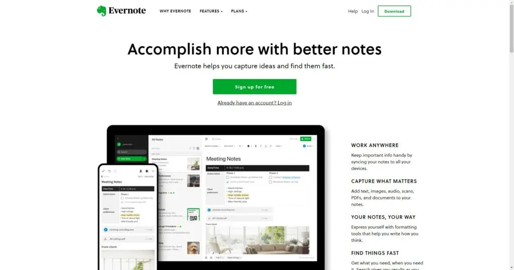 “Accomplish more with better notes.” Visitors to Evernote’s website understand what the app does from the moment they land on the page. Evernote uses whitespace to ensure that the bright green CTA button stands out to users. Plus, using “for free” in their CTA reduces friction for users who may be hesitant to pay for the app before knowing if it will work for their needs.