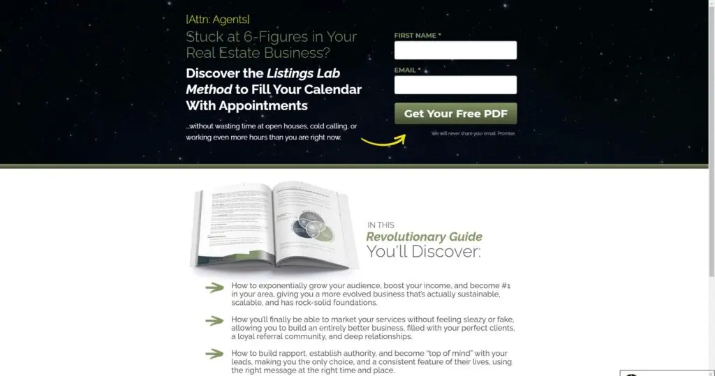 The Listings Lab uses an excellent CTA to encourage visitors to sign up for their lead magnet. While the button itself is a decent CTA example (“Get Your Free PDF”), we think the real CTA is “Fill Your Calendar With Appointments.” Those are such powerful words for a website whose visitors are real estate agents who want to get more clients and more appointments without “wasting time at open houses, cold calling, or working even more hours than you are right now.”