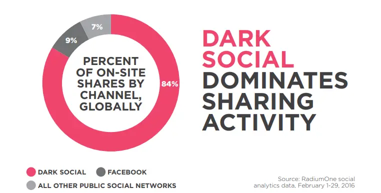 Dark social traffic is rising and now comprises a majority of all social traffic. In fact, according to a 2016 study by RadiumOne, dark social constitutes 84% of all social sharing activity.
