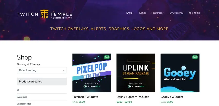 Twitch Temple bietet Twitch Overlays, Alerts, Grafiken, Logos und mehr. Sie bieten sowohl Premium- als auch kostenlose Twitch-Overlays an.