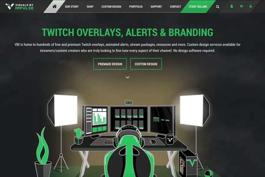Auf der Website Visuals by Impulse finden Sie Hunderte von kostenlosen und Premium-Stream-Overlays, Logos, Alerts und mehr. Diese sind alle mit Twitch, Mixer und Streamlabs kompatibel.