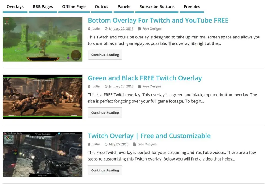 Obwohl diese Seite als Free Video Game Backgrounds bezeichnet wird, beinhaltet diese Seite tatsächlich eine Mischung aus kostenlosen, Premium- und kundenspezifischen Designs. Es unterteilt seine Angebote in Overlays, BRB-Seiten, Offline-Seiten, Outros, Panels und Subscribe-Buttons.