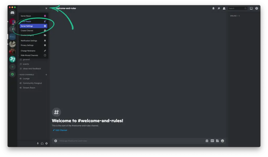To add roles, click on the arrow to the right of your server name (near the top left of the screen) and choose Server Settings.