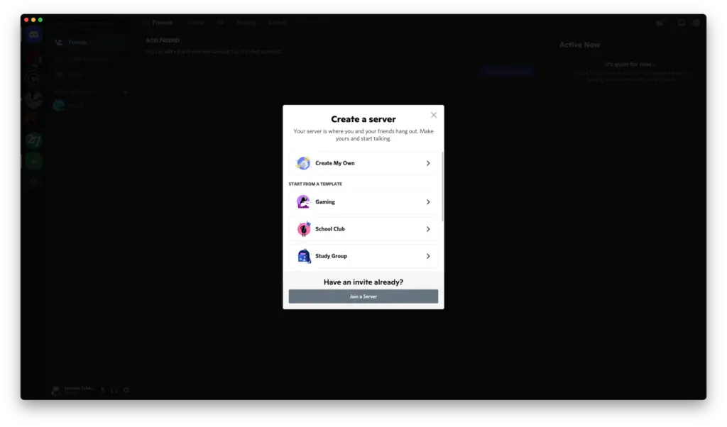 Creating Discord servers is ridiculously easy. Remember that plus symbol we mentioned earlier? You just click that and it will bring up a screen where you can create your Discord server from scratch, use a template, or join a Discord server.
