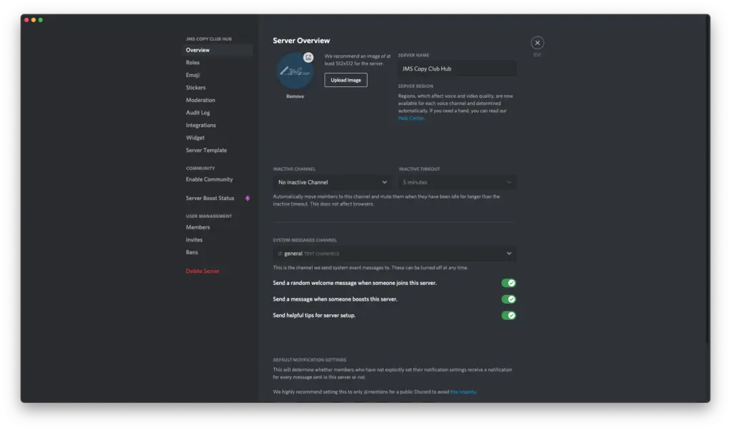 As you can see, there are tons of different settings you can use to make your Discord server truly your own. Along the left side of the screen, you're given options for: