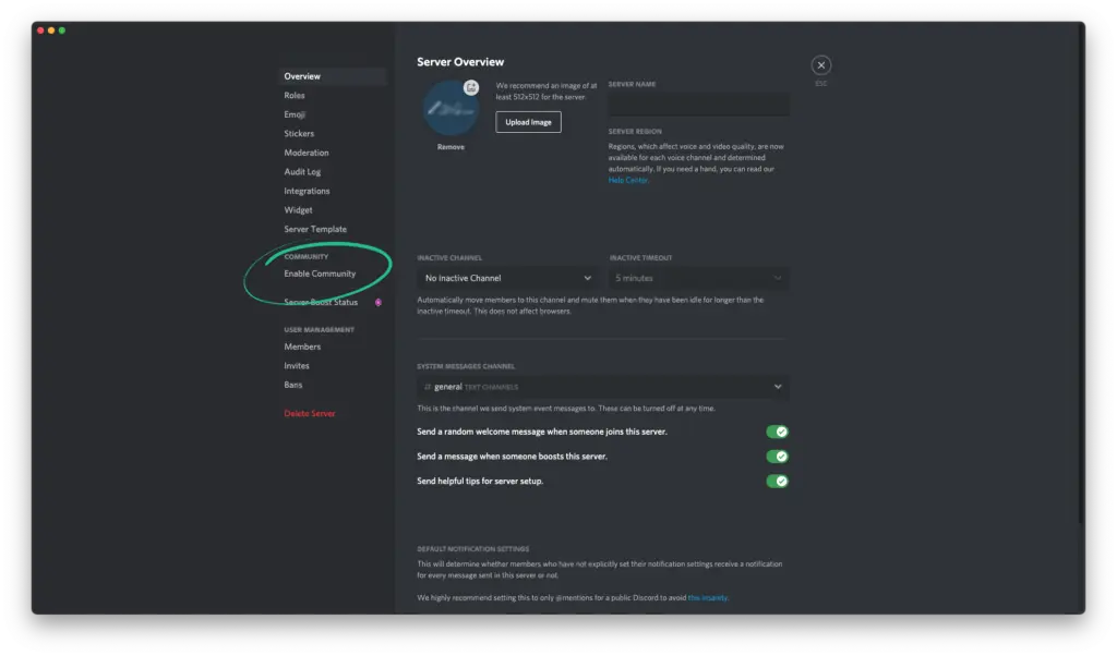 If you're interested in building a community on your Discord server, it should come as no surprise that you'll want to start a community. To do that, go into your Discord server settings and click Enable Community in the menu on the left side of the screen.