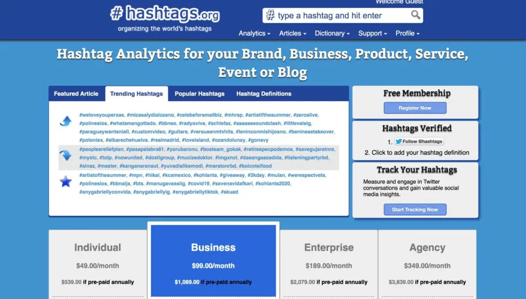 Hashtagtracking.com er et af de mere avancerede redskaber til at lave lister. Det er forsynet med otte funktioner, som er beregnet til at hjælpe én med at finde ud af mest muligt om de hashtags,. man interesserer sig for, og også at opdage mere. Funktionerne giver muligheden for at udforske rapporter om de seneste data om hashtags på sociale medier (en gratis service), adgang til en væg med streams, muligheden for at skabe, dele og opbevare rapporter og at få et detaljeret billede af hashtags’ historie og spore dem i realtid.