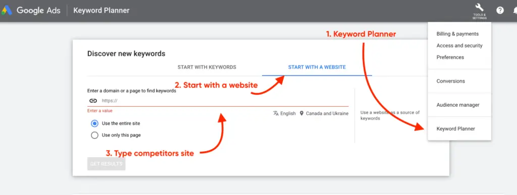 Where do I find the keywords? One option is to download them from Google Search Console if you have this service enabled on your site. For somebody else’s site you can use Keywords Planner in Google Ads: