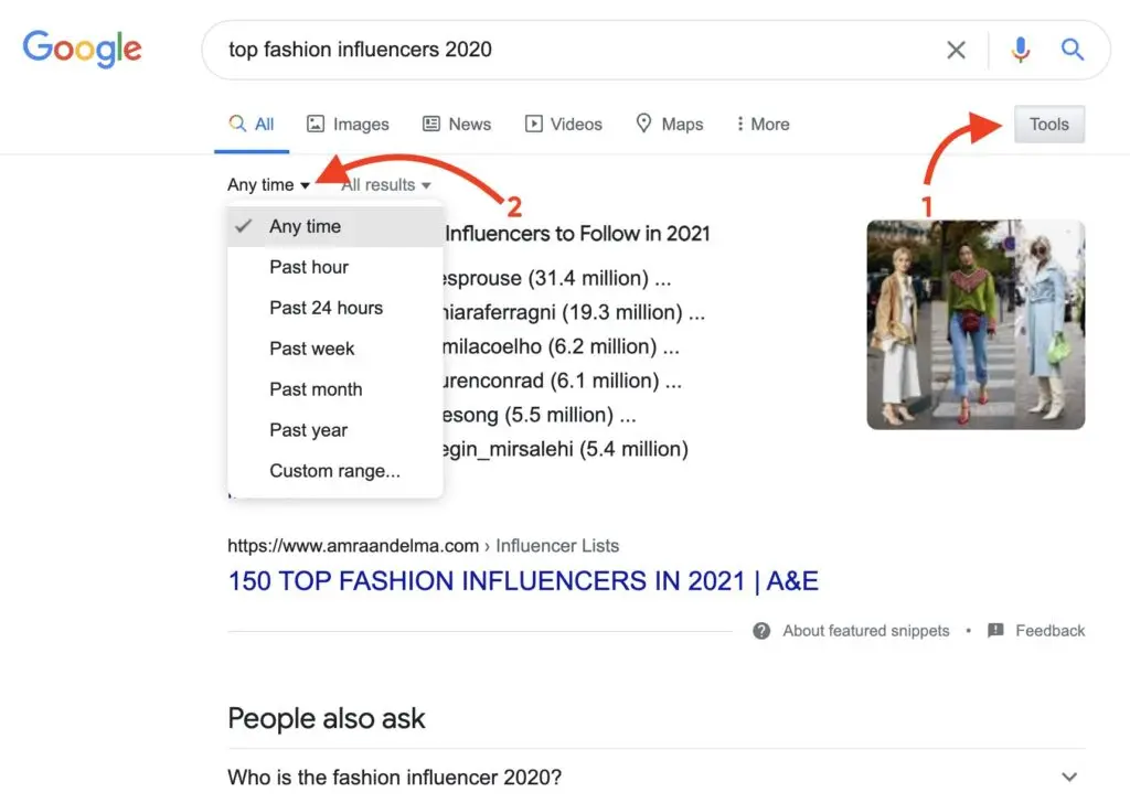 - Google – simply google something like “top fashion influencers.” You can switch over to Advanced Search and filter the articles by date. The downside to this method is that your search results will be filled with articles with influencer lists compiled by journalists from all sorts of media. Such compilations can be biased and they won’t give you a full overview.