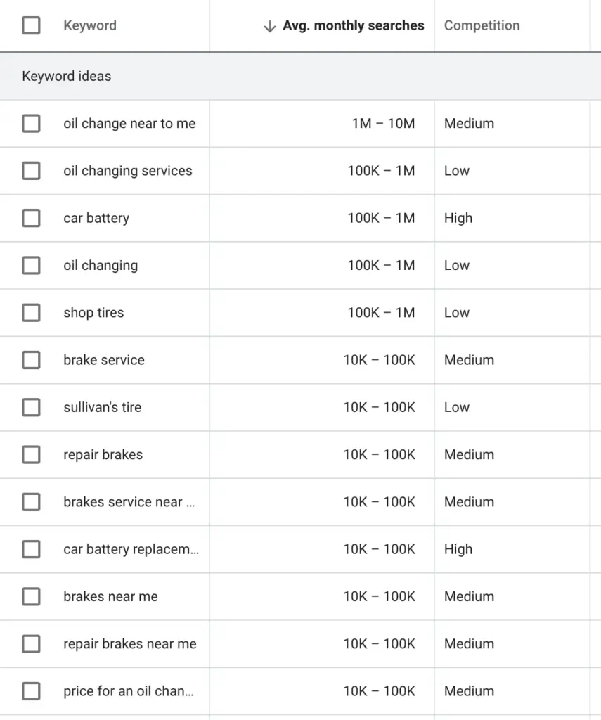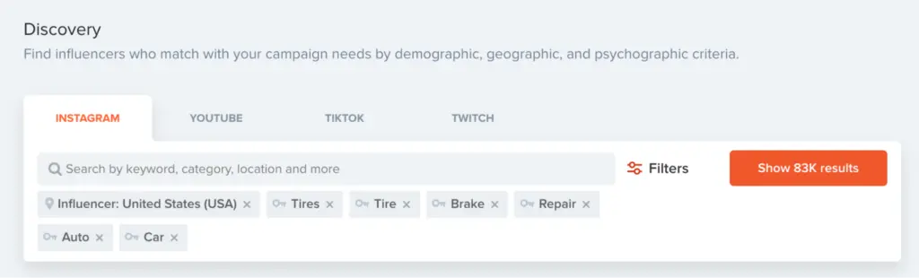 Once we find the keywords, we start to input them in our search for influencers. In our example, we began searching for a tire store: