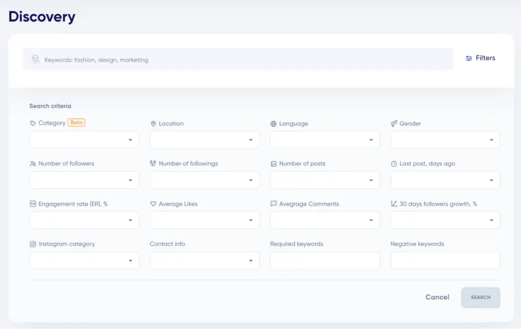 There are a number of external services that make the search by Instagram categories possible. In addition to this option, such services as trendHERO, HypeAuditor and Heepsy use AI to try and assign the influencers to their proprietary categories based on the content they post. For example, if a person writes about promoting and building up accounts, they are put in the Marketing category, and if someone’s main content is their kids and husband, it’s Family, Kids, and Relationships.