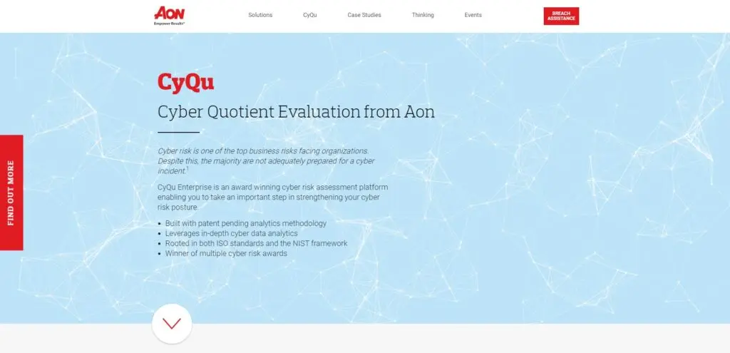 The Cyber Quotient Evaluation from Aon uses CyQu Enterprise, an award-winning cyber risk assessment platform. In about 90 minutes, CyQu Enterprise provides you with a snapshot of your cyber maturity and insight into the areas posing the greatest risk to your organization.