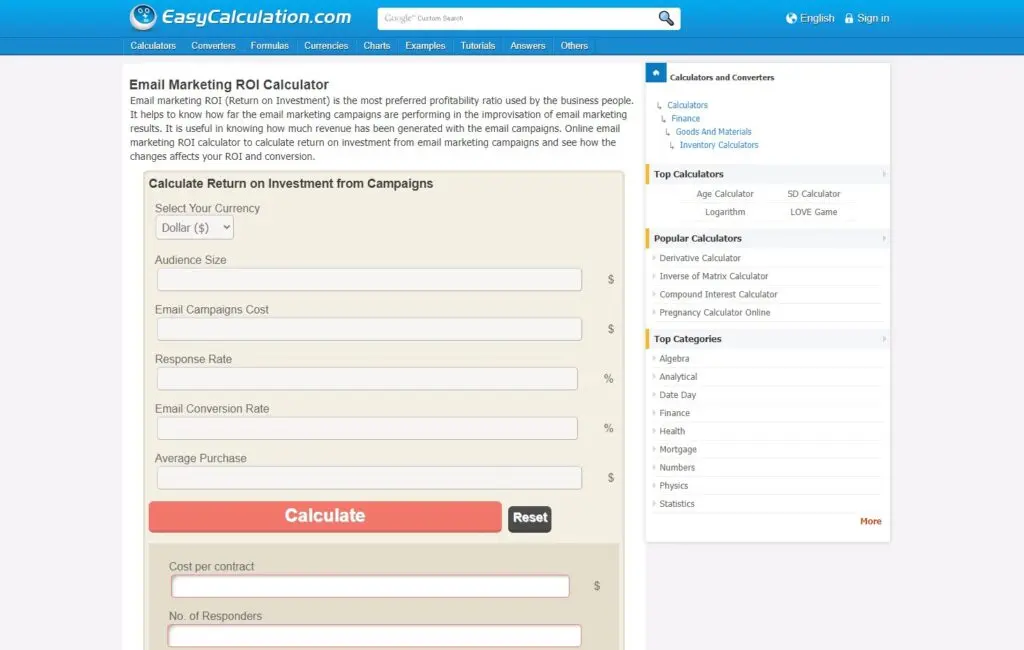 - 4. Email Marketing ROI Calculator (EasyCalculation)
