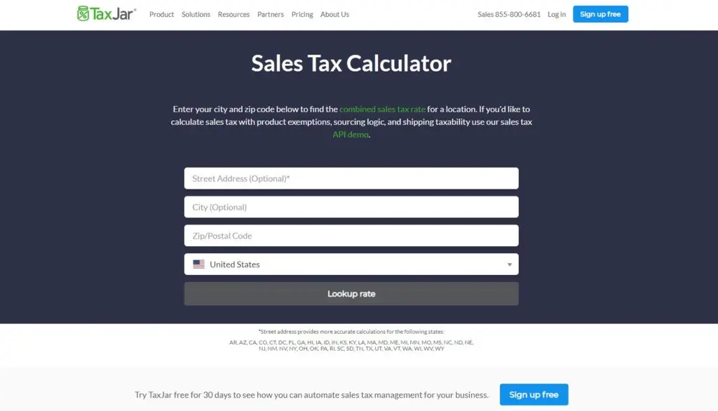 The TaxJar Sales Tax Calculator calculates the relevant sales tax you need to charge in the United States and 30 other nations.