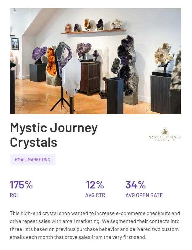 Email marketing involves various components - from crafting compelling content to designing aesthetically pleasing templates and analyzing the outcomes. Ideally, the agency should offer a comprehensive suite of services, ensuring every aspect of the campaign is under expert supervision. Take WEBITMD as an example. The agency offers comprehensive email marketing services, from strategy creation to copywriting, design, and automation, specifically geared for eCommerce brands. This is expertly shown in their work for Mystic Journey Crystals, where they managed to increase ROI by 175%, achieve an outstanding average CTR of 12%, and an impressive email open rate of 34%. They achieved these impressive numbers by segmenting their contacts before developing custom emails to target specific customers.