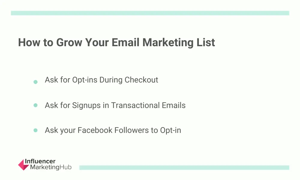 Transactional emails (order confirmations, shipping confirmations, and the like) are often overlooked but they’re marketing goldmines. You could easily add a link to your opt-in to make it easy for recipients to subscribe from those emails.