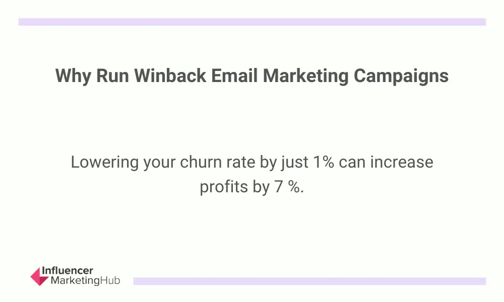 A winback campaign is an automated email marketing series that seeks to re-engage lapsed subscribers or customers. And they’re really beneficial. According to PriceIntel, lowering your churn rate by just 1% can get you a 7% boost in profits!