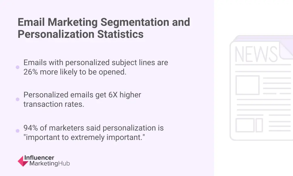 Segmenting is going to make personalization a whole lot easier. And personalization gets results. In fact, emails with personalized subject lines are 26% more likely to be opened (Campaign Monitor) and personalized emails get 6X higher transaction rates (Experian). That’s probably why 94% of customer insights and marketing professionals across industries said personalization is “important,” “very important,” or “extremely important” for meeting their email marketing objectives (Conversant Media).