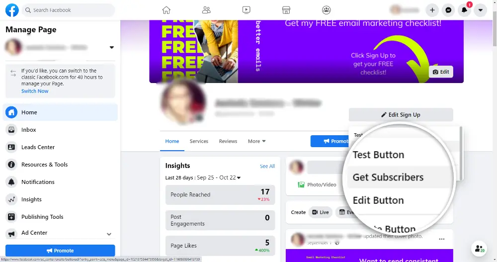 If you have a Facebook page for your business, add a sign-up button by hovering over the button and selecting Edit Button from the drop-down menu.