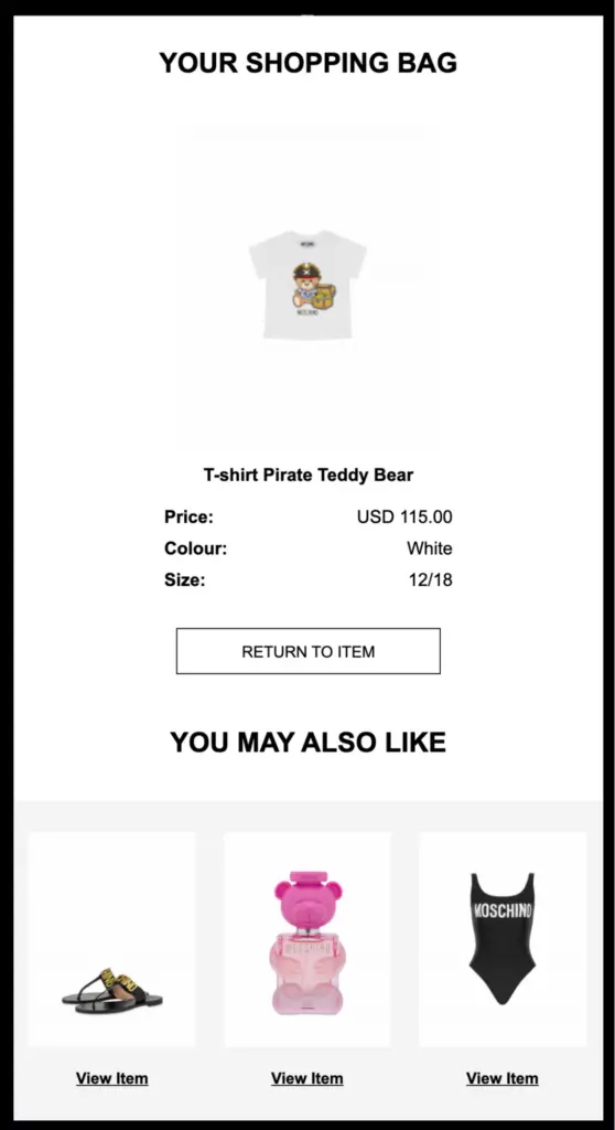 For example, Moschino chose to include product recommendations on its checkout page instead of its product pages. This way, they can possibly cross-sell other items based on the user’s preferences to boost the average order value.