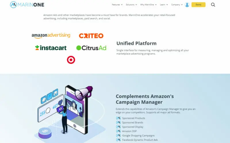 MarinOne helps businesses accelerate and optimize their retail-focused advertising campaigns. Furthermore, it lets you take Amazon’s Campaign Manager a step further by making use of tools and capabilities like automated bidding, promotional calendar, and marketplace signals. One of MarinOne’s best features is it supports multiple major ad formats, including the following: