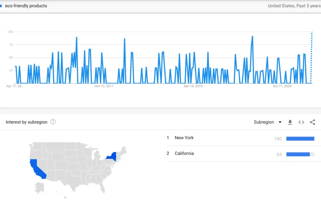 What's popular? A simple, free tool like Google Trends can give you a great idea about the amount of interest there is in an eCommerce niche you're considering. Google Trends will show you searches over time for your potential niche as well as interest by location. Here's an example for "eco-friendly products:"
