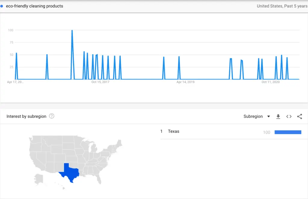 You'll notice that interest in "eco-friendly products" is prominent in a couple of states. Interestingly, "eco-friendly cleaning products," an even narrower niche, is most popular in an entirely different state: