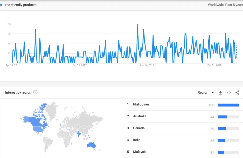 If you already have a specific geographic location in mind, you can run reports based on that. Want to go global with your eco-friendly products? Google Trends can help you decide where you want to spend your marketing budget: