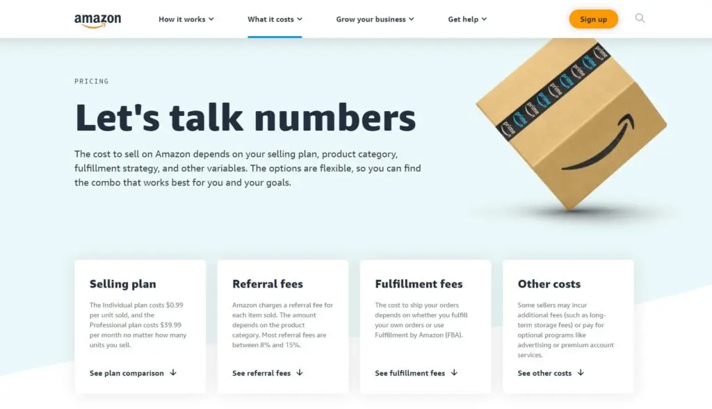 Similarly, if you opt to operate via an existing marketplace, you will face various fees. You will need to pay $39.99 per month for a professional account on the Amazon Marketplace, where you can sell an unlimited number of items. You will then have to pay a referral fee when you sell items that varies depending on what you sell. These range from 6% for personal computers (and a few other things) up to 45% for Amazon device accessories. Amazon details these costs on their Pricing page.